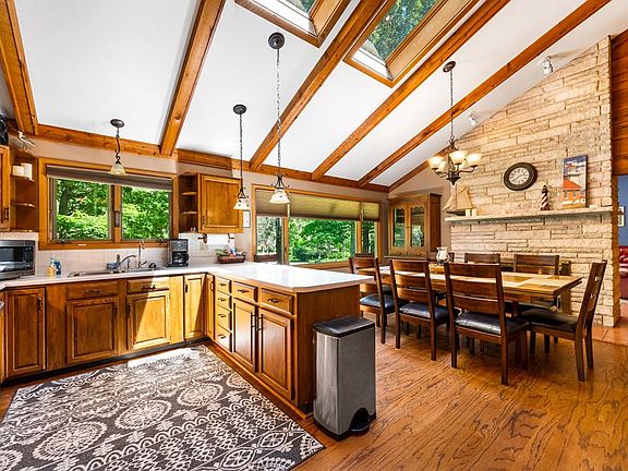Beautifully appointed sprawling ranch home offered, fully furnished on 2.5 acres with a heated garage. This home boasts many desirable features including large eat-in kitchen sharing pass-through fireplace with family room, with plenty of space to entertain inside and out. Bonus room can enjoyed as-is or be easily converted to additional attached garage. The outbuilding provides plenty of storage for winter and summer toys. Circular drive extends around back of home to provide secluded and ample parking space. Basement has 10'ceilings. Sellers are motivated.