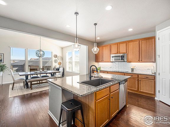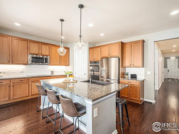 Welcome to this gorgeous 1 story home in the highly desirable Barefoot Lakes neighborhood. Everything you need is conveniently on the main level. The kitchen is a dream with a large island with seating, granite countertops, double ovens and stainless steel appliances. The light filled dining room off the kitchen is a great place to entertain. Open to the kitchen is a spacious living room with a cozy gas fireplace. The primary bedroom features a coffered ceiling and wall detail plus a walk in closet and ensuite 5 piece bathroom. The primary bathroom has a double vanity and separate glass encased shower and soaking tub. Bedrooms 2 & 3 are light filled with a lovely full bathroom in the hallway between them. Working from home is a breeze in the dedicated office with fiber internet that was just installed. Alternatively, the office could be used as a playroom or craft room. The roomy laundry room is also on the main floor with the bedrooms so no more hauling clothes up and down the stairs. The basement is insulated and offers another 2,149 sqft of endless possibilities. The large covered patio is great for enjoying Colorado year round and the low maintenance zeroscaped backyard offers all the benefits without the hassle. Bring all of your toys and vehicles, they can easily fit in the 3 car garage. Don't miss the lowest priced 1 story home available in Barefoot Lakes. Schedule a showing today!