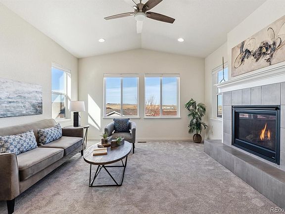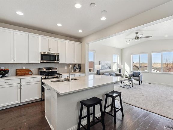 Beautiful and thoughtfully designed ranch-style home, located in the north suburbs most popular 55+ community, Skyestone. Bright and inviting living spaces with nice views of open space and the mountains. Main floor office! Engineered hardwood floors, quartz countertops, and GE appliances bring a touch of luxury to the main living areas, while a separate laundry room and mudroom enhance everyday convenience. The front yard features low-maintenance xeriscaping, and the recently extended back deck adds even more outdoor living space, complete with a new staircase leading to the backyard. The spacious basement offers endless possibilities, whether for a media room, game room, or additional living area.