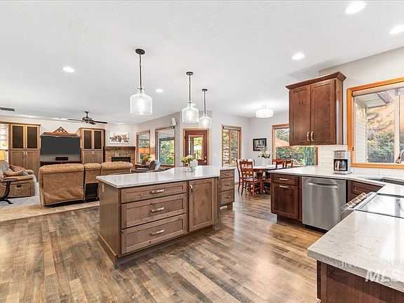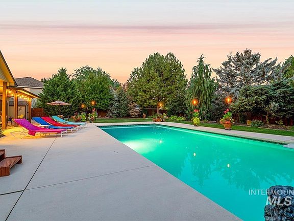 Your wait is over, jump now to have the entire season of warm weather to enjoy your backyard swimming pool with family & friends. The home is a meticulously maintained 1-owner traditional style home with a fully finished basement, a 4-car garage w/pull-through bay, an outstanding backyard full of mature landscaping, and an extensive patio space ideal for entertaining. This wonderful 5-bedroom/4-bath W. Boise home was remodeled in 2022 to update the main living area & create a designer kitchen you will love. The basement offers a bedroom, full bath, secondary family room w/fireplace (also plumbed for wet bar/sink), multiple storage rooms and also has 2 access points with one being from the garage which offers easy access to the patio and pool area. This setup is a great option for someone seeking multigenerational living space or possibly extra rental income. The home resides in a very desirable neighborhood on a cul-de-sac street and has a very private & beautiful backyard. Don't miss out on this great home!
