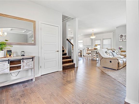 Classically designed two-story home greets all with a large front porch. Main level features sun-filled, open floor plan with hardwood floors, native stone fireplace with built-ins, formal dining room and excellent flow for entertaining. Huge kitchen features large eat-in island with honed-finish granite, loads of cabinetry, stainless appliances plus spacious built-in pantry and breakfast area. Convenient main floor bedroom with full bathroom is perfect for guests or a home office. Second floor features loft play area, three secondary bedrooms with walk-in closets plus two full bathrooms. Laundry opens to upper hallway and master suite and has built-in cabinet storage, folding counter and hanging space. Master bedroom is spacious with ample space for sitting area or office. Master bathroom has neutral tile, tall vanities, jetted tub, walk-in shower plus wonderful walk-in closet. Storage space abounds with three car garage and unfinished basement. Enjoy the spacious lot with covered patio plus plenty of room for a garden or play set. Fantastic neighborhood amenities with pool, splash ground, sand volleyball, play area and located directly across from Clare Road Trailhead for Cedar Niles Trail. Excellent location and close to everything! Quick access to area schools, highways, restaurants, shopping and golf courses. Award winning Olathe School District offers bountiful programs and resources for students and families.