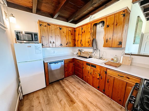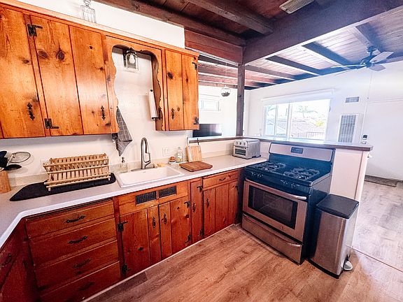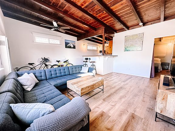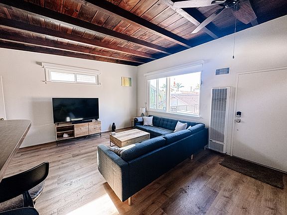 This charming rear unit is just a few steps from the beach, offering a private front deck perfect for enjoying the sunset! Situated above the main house, this unit boasts no shared walls and no neighbors below. Upon entering, you'll find a generously sized open living room with coffered ceilings, a spacious bar counter, and large windows that flood the space with natural light. The open kitchen is equipped with a range oven, dishwasher, refrigerator, and attractive wood cabinetry. The living area easily accommodates a large sectional sofa with plenty of extra space. All windows feature lovely newer window coverings neatly concealed behind valances for a subtle touch. The bedroom is bright with additional windows, an AC unit, and ample closet space for storage. The bathroom is connected to the bedroom and showcases unique and eclectic green tiles, extra built-in cabinetry, and an additional closet. Do not disturb current tenant. Apartment will be delivered vacant and unfurnished. Owner pays water/trash. Tenant pays gas, electric, internet. Back unit above garages. No parking, no onsite laundry. No pets, no smoking.