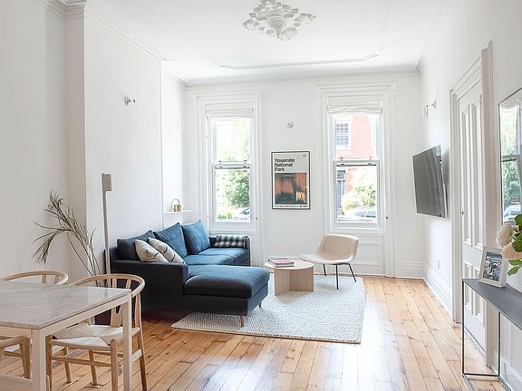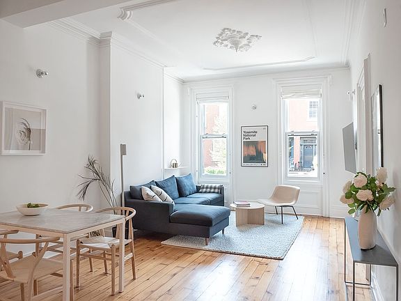 **FURNISHED UNIT, PRICE INCLUDES ALL UTILITIES. The bright and airy 2 bedroom/ 1.5 bathroom furnished unit is approximately 1,000 SF and has been renovated with a meticulous attention to detail that highlights the prewar charm and character yet it features contemporary elements: soaring high ceilings, period moldings, reclaimed wood floors, 1 decorative fireplace, exposed brick, brand new Anderson windows and recessed dimmable lighting. The kitchen opens up to a large living/dining area and features stainless steel Bosch and Liebherr appliances including dishwasher, marble countertop with bar stool seating and lots of storage. All bedrooms have custom built closets and are facing the quiet rear of the building. The second bedroom is currently set up as office. In addition to the modern master bathroom with shower, tub, linen closet, TOTO washlet and heated radiant floors the apartment has a sizable powder room. Additional features include a full size washer/dryer, WiFi video intercom, through wall heating/air conditioners and excellent closet space with ELFA shelving. This unit has a private backyard. The brand new roof deck, accessible to all units, with wide open views of Manhattan. The apartment is available from August 15, 2023. Monthly rent includes all utilities (heat, electricity, water, internet). Does not include regular cleaning. No pets allowed. Furnishings include Blu Dot, Hay, Nordic Knots. Lease up to 12 months until August 15, 2024. Smoking allowed:No