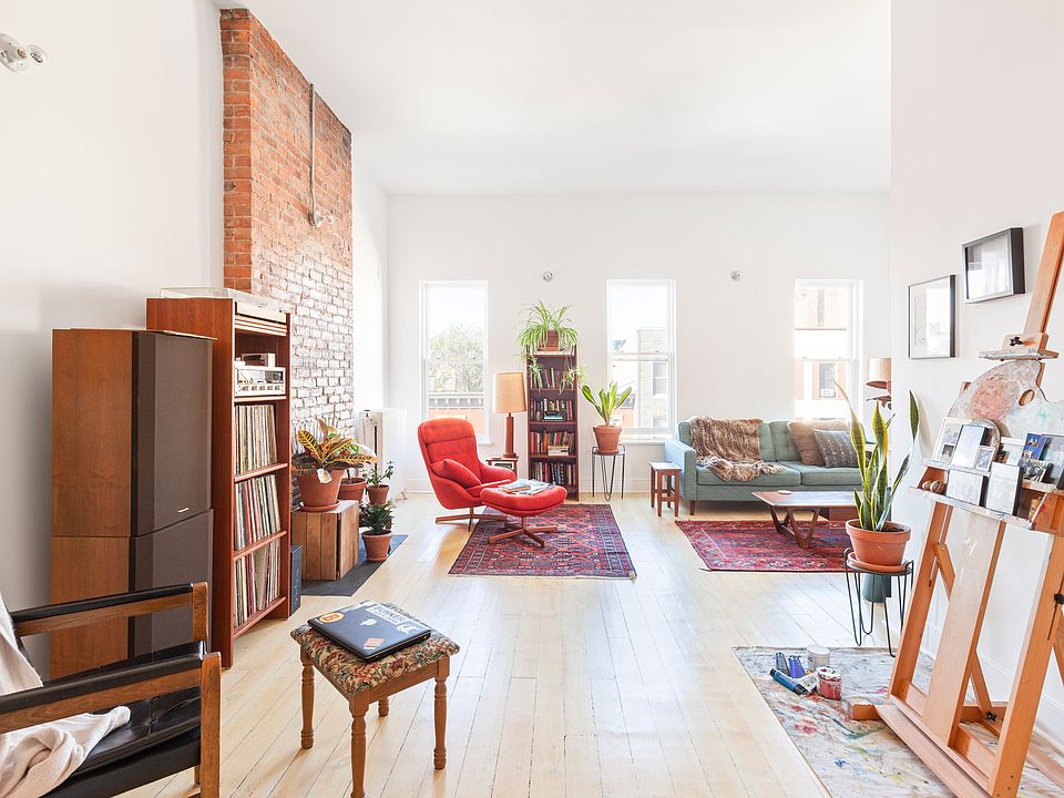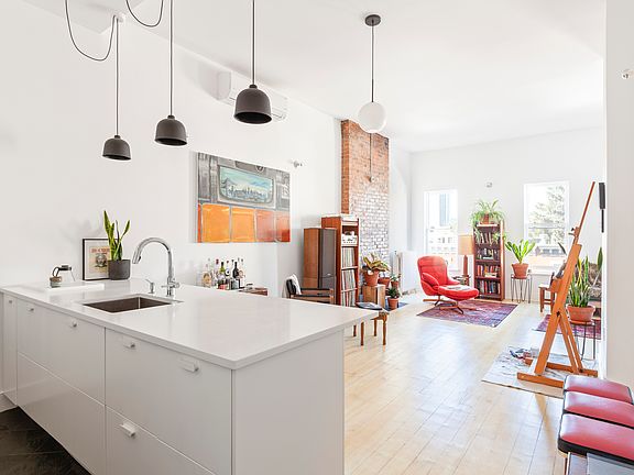 The bright and airy 2 bedroom/ 1.5 bathroom unit is approximately 1,100 SF and has been renovated with a meticulous attention to detail that highlights the prewar charm and character yet it features contemporary elements: soaring high ceilings, period moldings, reclaimed wood floors, 2 decorative fireplaces, exposed brick, brand new Anderson windows, and recessed dimmable lighting. The kitchen opens up to a large living/dining area and features stainless steel Bosch and Liebherr appliances including a dishwasher, Caesarstone countertop with bar stool seating, and lots of storage. All bedrooms have custom-built closets and are facing the quiet rear of the building. In addition to the modern master bathroom with shower, tub, linen closet, and heated radiant floors the apartment has a sizable powder room. Additional features include a full-size washer/dryer, WiFi video intercom, through-wall heating/air conditioners, and excellent closet space. Brand new roof deck, accessible to all units, with wide-open views of Manhattan. The monthly rent is $5200 and includes water. No pets allowed.