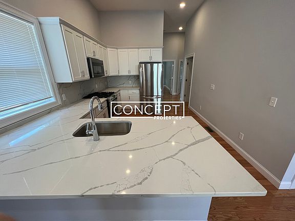 East Somerville Closest train = East Somerville (Green Line) 3 bed/2 bath (first floor, left-side unit) Brand New Everything 2022 (all high-end finishes) Massive living room open to kitchen Skylight above beautiful winding staircase Gorgeous white-granite counters New cabinets New stainless-steel appliances Hardwood floors Modern/tiled bathrooms Central heat and AC (with NEST thermostat) In-unit laundry Private deck Door buzzer & intercom system Bike room available for tenant s use
