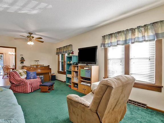 Nice 2-bedroom ranch - move-in ready condition! Living room is very roomy - 22' x 12'. Large eat-in kitchen and appliances stay! Conveniently located laundry - great feature. Huge 20' long master bedroom offers space for reading nook or computer/desk area. Newly painted second bedroom completes the main floor. Full basement offers 2 more completely finished rooms - play room or office and plenty of room for guests. There is also a partially finished area - 37' x 12'. Sellers have really enjoyed the basement space! There is a nice newly-stained deck right off the kitchen area. Oversized detached 2-car garage also. Small town living - just minutes away from Wichita. NEW ROOF COMING SOON!!