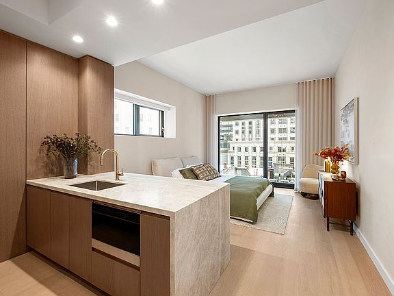 Residence 1005 is a south-facing studio with 10'6" ceilings and a well-balanced layout defined by thoughtful design. Fine 7-inch White Oak plank flooring adds warmth and texture, while oversized 8-foot windows enhance the sense of scale within the space.