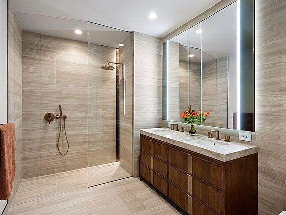 The bedroom is tranquil and proportioned for comfort, while the bathroom is wrapped in natural textures - custom White Oak dual vanity with integrated lighting, quartzite countertops, glass-enclosed rain shower and Brizo fixtures in brushed Luxe Gold.