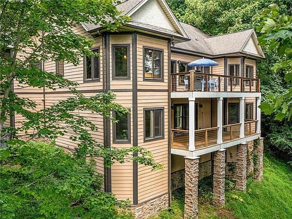 Contemporary modern home built with European flair! This beautiful home nestled among mature landscaping feels very private with tree top views, yet is only minutes from Biltmore Park and the Blue Ridge Parkway. The flowing layout is great for entertaining, with an abundance of windows and natural light. The stacked stone fireplace with wood vaulted ceilings and skylights make a stunning focal point in this home. The kitchen was designed by Snaidero, with quartz countertops, a center island, a Miele double wall oven, glass accented cabinets, and a wine fridge. The primary suite includes a European closet system, a marble surround walk-in shower, a soaking tub, and a floating vanity. The office has a full bath for guests and built-in murphy bed, and the finished basement includes 2 bedrooms with 2 full baths, walk-in closets, and a family room with a brick fireplace and access to the back deck. Lots of storage in the unfinished basement and a mini gym set up. Three-car garage attached.