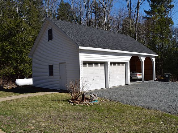 You'll fall in love with this custom post & beam 3 bedroom, 2.5 bath home perfectly situated on a 1.63 acre keyhole lot offering seclusion yet the convenience of being less than 10 miles to Albany, 6.5 miles to I-90 Exit 8, and only minutes to stores, restaurants, area lakes, and schools... just walk to Butler Town Park or Averill Park High School! Set back from the road with a curved driveway, this is a wonderfully private setting! There's a newer (2012) 4 car (40' x 24') detached garage offering a new 60 AMP electric panel, 2 overhead doors, and 2 open bays. There's also walk-up storage overhead. This home offers quality construction including 10" thick insulated foundation walls, SIP (structural insulated panels) and Andersen vinyl clad double pane tilt-in windows. The timber framing was cut from logs from the Ticonderoga area and were rough sawn at Paulson's Wood Products in North Petersburg. The joinery was done at Star Ridge Designs in Petersburg, delivered to site, and Star Ridge finish planed and routed the beams and erected the frame on onsite. The sub-floor/exposed ceiling is tongue and groove white pine from Mayfield, NY, the first floor window and door trim is white oak from the property itself, and the cherry window trim in the kitchen is from Mayfield. Additional features include a Weil McLain propane boiler for zoned radiant heat (all 3 floors), 150 AMP electric, public sewer, and a drilled well. Outside offers a side deck, paver walkways, and a patio area surrounded by landscaping with a walkway to the heated in-ground Concord "lagoon" style pool with vinyl picket fencing. Inside you'll enjoy the bright & open floor plan & many updates: new ThermaTru front door, updated lighting throughout, and updates to all baths. The foyer offers a cathedral ceiling, chandelier, and ceramic tile that extends into the formal dining room and through to the kitchen and partial bathroom. In the kitchen you'll find an abundance of cherry cabinets, Wilsonart solid surface counters, and the appliances are included: newer GE gas range w/oven, new GE microwave, Kenmore dishwasher, and the Maytag refrigerator. There's a double door coat closet by the side door entrance, and the partial bathroom features a new vanity cabinet w/ marble top & a new lighting fixture. The spacious living room / family room offers neutral carpeting and an atrium door to the patio area, yard and pool. Upstairs you'll find the three bedrooms w/ carpeting and vaulted ceilings. The master bedroom features a double door closet and master bath with skylight, ceramic tile shower and flooring, new lighting, and a new vanity cabinet w/ granite top & new faucet. There's also a heated towel bar w/ a timer! Bedrooms 2 & 3 both offer spacious closets. The 2nd full bath features a new fiberglass tub/shower, new wood laminate flooring, and a new vanity cabinet, lighting & faucet. There's a convenient laundry chute in the hallway that leads to the basement! The full basement offers 9' ceiling height, a Bilco door exit, and finished areas (just add finish flooring if you prefer) perfect for a recreation area and craft room. The unfinished portion of the basement is where you'll find the mechanicals and the laundry area (Samsung front load washer and dryer included). For those who would like to add a fireplace in the basement and/or on the main floor, the house was constructed with a 12" slab under the area where it could be placed with the framing of the house constructed to accommodate a fireplace as well.