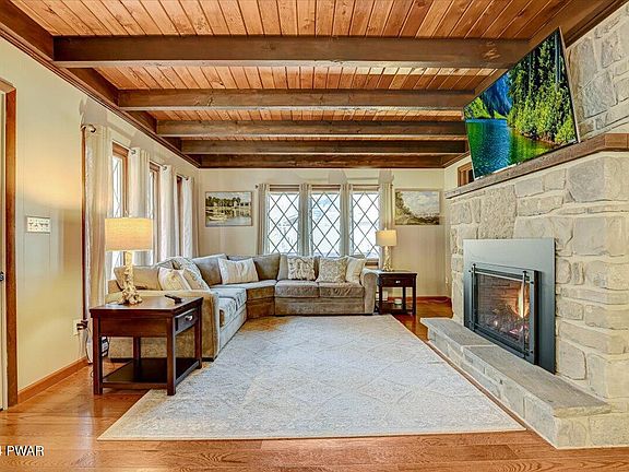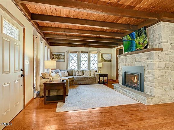 Renovated Tanglwood Lakes 4 bed, 2 bath Chalet on almost 1 acre with a beautiful backyard & wrap around deck! The main level open floor plan features new hardwood floors throughout, living room with a gorgeous stone propane fireplace, spacious dining area, kitchen with custom cabinets & lighting, granite counters & stainless-steel appliances. 2 bedrooms and an updated full bath complete this level. Upstairs you'll find 2 additional bedrooms and an updated full bath. The walkout lower-level features new tile floors, granite bar, double sliders, propane stove, and plenty of additional living space. Enjoy outdoor living with a screened-in porch, large wrap around deck, covered patio & plenty of parking. Freshly painted inside & out, mini split units, tankless water heater, and whole house filtration system are just a few of the many updates this home has to offer! Lake Wallenpaupack lake rights and close to Route 84. Pool table included.