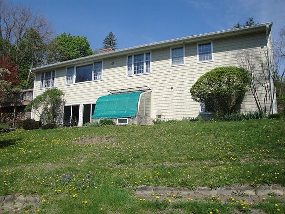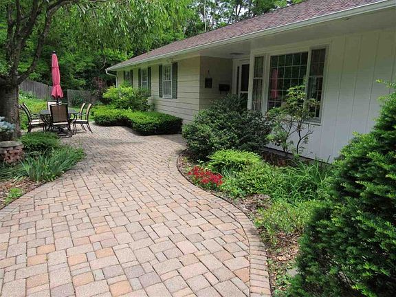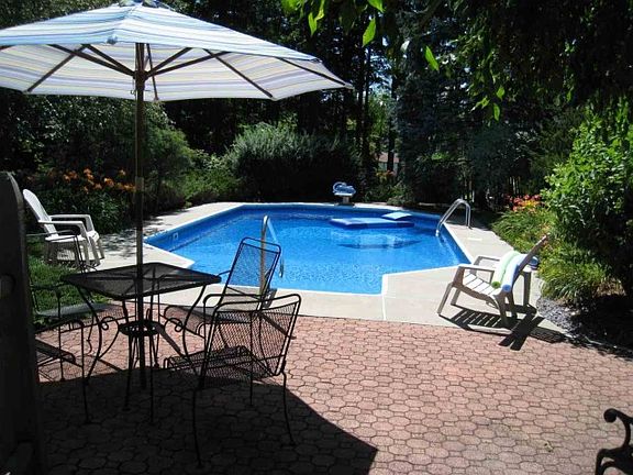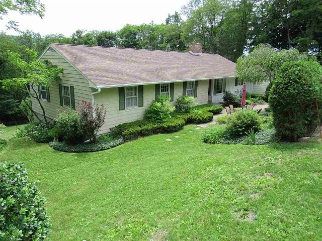 Located near the end of High Street, a quiet impasse street, this home is so surrounded by trees and woods; you hardly feel just a few blocks from the town center. The property is very private and elevated, offering southern valley views. Pulling into the drive way gives you access to the attached two car garage with a new electric door and ample attic storage. The walkway from the driveway to the front door expands into a large hidden front patio area with seating surrounded by mature landscaping, an expansive stone wall and high privacy hedges. Walking around the back side of the garage puts you onto an elevated composite deck with access to the garage and home. A staircase will lead you through a mature conifer garden and down into the very private back yard. Sloping away from the home, the lawn features a terraced vegetable garden and in-ground pool, beautifully landscaped with a large accent stone wall and bricked patio area. Other notable exterior features include: a brand new asphalt architectural roof and gutter system (2014), whole house motion detector flood lights (2013), pool has a new liner and winter cover (2011). You can enter the home on the main floor via the front door, back deck sliding door, or into the kitchen from the attached garage. The front door leads into a foyer with access to the kitchen, living room, and hallway to the bedrooms. The kitchen features stainless GE Profile dual fuel gas stove and microwave, dishwasher and full size refrigerator. Hardwood flooring, counter tops, and custom cabinets are all less than 10 years old. Eat-In dining area or breakfast counter allow for more formal dining or a quick bite on the go. Just off the kitchen is the living room and attached formal dining area. This large great room has a wood burning fireplace (new enclosure 2010), large thermal paned picture window (new 2010) with southern views over the backyard and pool, access to the back deck, and the staircase to the lower levels. The bedroom hallway leads from the front foyer to the main bathroom, 2 bedrooms, and master suite. The two guest bedrooms have either one or two windows, large closets, and hardwood flooring. The main bathroom has tile flooring and a large step in shower (updated 2010). The hallway also has a very large towel closet with a laundry chute to the laundry room, and a linen closet. The master suite is a large bright space with hardwood flooring, two closets (the walk-in closet has an additional cedar lined closet). The tiled en-suite master bath has a custom porcelain tub with tiled shower walls (updated 2010). The staircase from the main floor living room leads down to a lower hallway. The first door opens to a recreation room that is currently utilized as an exercise room. This space has a dual recessed mood lighting system, independent exterior venting, and wired for entertainment. A door leads into the remodeled laundry room with ample storage. Moving through another doorway leads into the basements space with built-in storage shelving, hobby/work bench area, and the house’s system controls. Electrical panels and pool timer, high efficiency furnace with easy natural gas conversion, hot water heater, and whole house water filtration system (2013). The lower hallway leads in the other direction, through a doorway to a computer nook with built-in book shelving and display cases. Step down four steps to a very large downstairs living area with high ceilings, stepped fireplace, built-in library book shelving, and three large sliding glass doors (new 2006) leading to the back patio area and pool, and attached Lord and Burnham curved glass greenhouse. This space also contains a wet bar with sink and refrigerator. Off the great room is a hallway leading to a tiled full bath with tub and shower (2008) and a king bedroom with large closet. This downstairs area is perfect for parties and entertainment, or could easily be converted into an In-law apartment.