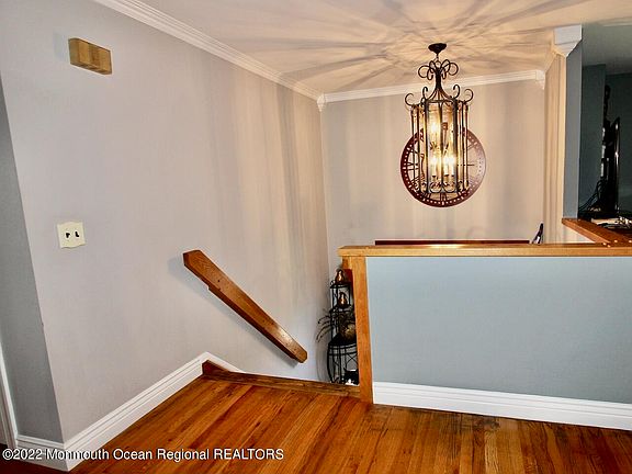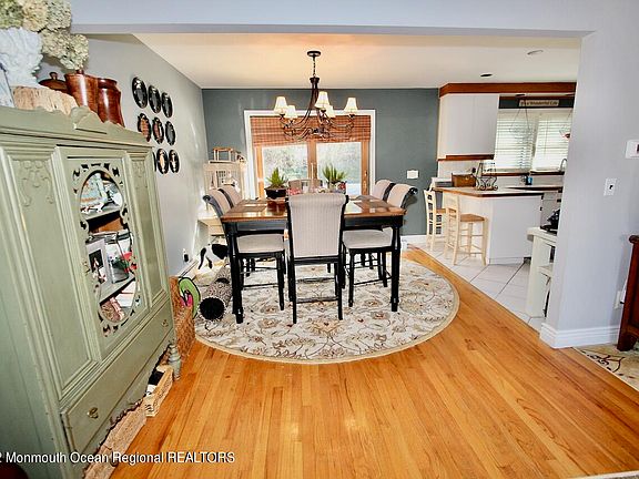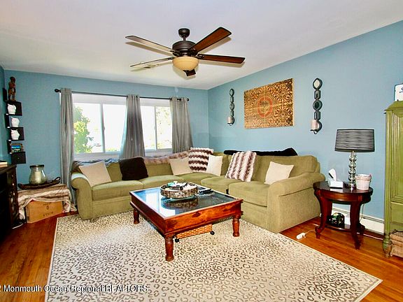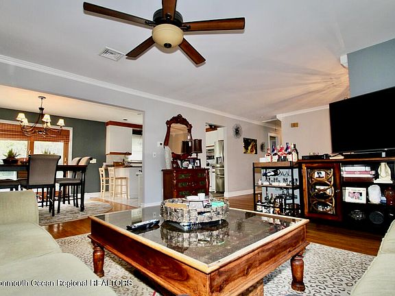 Shark River Hills 2100 Sq Ft home near park and river. Beautifully kept & comfortable home. Wide oak entry, hardwood floors, large kitchen with lunch counter , Dining room with sliders to the tiered deck and private backyard. Relax in the living room with crown molding and Anderson sliding picture window. 3 bdrms, updated baths - 2nd bath has a steam shower. Three Zone HWBB heat plus new cen AC. Navien system on demand hot water. Luxurious downstairs great room is above grade with full size windows. New gas fireplace and a place for your home office. Laundry room with storage, garage. Convenient to JSMC, GSP, I95 & Rt 18, Marina, golf, beach.