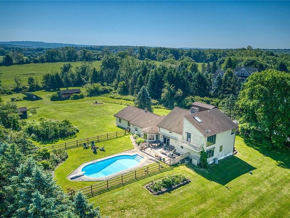 Private and flanked by high end properties off a quintessential country road just minutes from the Village of Millbrook and the Hamlet of Clinton Corners rests this custom contemporary. Generous windows frame surrounding beauty while inviting cascades of light. This open flow home greets with vaulted ceilings and double sided wood burning fireplace with floor to ceiling stone servicing two lounge areas for ease in both living and entertaining. The kitchen features finely crafted cabinetry and Viking gas cooktop, Thermador double oven and Bosch dishwasher. The second floor exclusively hosts the ensuite primary bedroom with balcony overlooking the 32'x16' in ground pool. Adjacent to the attached garage awaits a 27'x28' workshop. Additional one car detached garage and multiple sheds on property. Solar panels are owned and convey. Move in as is or opportunity for a higher price point buyer justifying surrounding valuations, setting and location for next level boost.Docs attached to listing Additional Information: Amenities:Storage,ParkingFeatures:1 Car Detached,2 Car Attached,