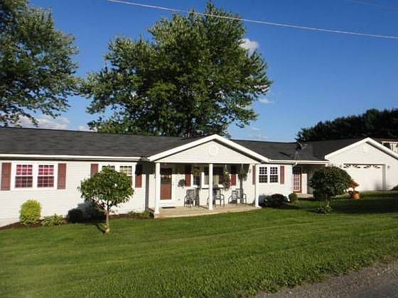 Sprawling vinyl sided ranch with 4 bedrooms, 1.5 baths, living room, dining room, eat-in kitchen, sunroom, main floor laundry, covered front porch, deck and a 2 car attached garage.