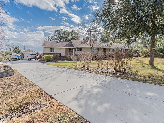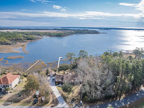Stunning waterfront brick ranch boasting breathtaking views of Bogue Sound on a nearly acre-sized lot. Conveniently situated just minutes away from Emerald Isle beaches. This peaceful waterfront residence in Hunting Bay offers unparalleled access to the ICW, making it an ideal location for fishing, kayaking, and boating enthusiasts. The private dock, complete with a kayak launch and two kayaks, allows you to fully embrace the water. Additionally, the community boat ramp is a mere 1/4 mile away, providing easy access to launch your boat and keep it at your private dock throughout the summer. Located in the Croatan school district of Carteret County and a reasonable commute to Camp Lejeune and MCAS Cherry Point. Featuring 3 bedrooms and 2.5 baths, this home showcases elegant hardwood floors throughout the living area, a sunroom, and an office with a separate entrance. The living room has a vaulted ceiling and sky lights. The kitchen has lots of cabinets, granite counter tops and a gas range. A very private back yard. The detached brick workshop, with both heat and A/C, offers extra storage space, and there is a fish cleaning station outside of the workshop. The oversized 2 car garage has shelving and a good size storage room, providing ample room for all your belongings. This home received a new roof, no storm damage, and dock after Florence and remained unaffected by flooding during the storm. The HVAC system was replaced in 2022. Don't miss out on the opportunity to own this remarkable waterfront retreat and make it your permanent residence. Contact us today to schedule a private showing.