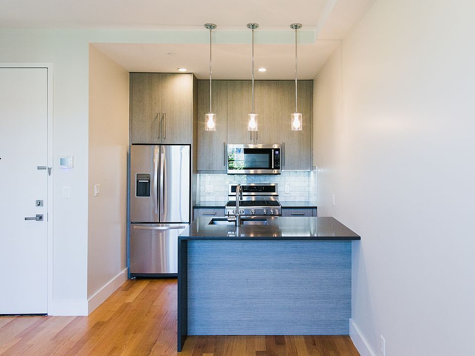 Top floor 1-bedroom apartment in a newly built boutique rental building is available for rent as of July 15. This apartment offers a great view of the city skyline and the treetop through beautiful arched windows. Tenants will enjoy a washer and dryer, central AC, and hardwood oak floors. Kitchen features stainless steel appliances, custom-made cabinetry with undermount LED strip, and enlarged waterfall kitchen island which creates a comfortable dining or workplace area. Marble bathroom has a deep soaking tub, large vanity, an oversized mirrored medicine cabinet, and heated floor. There is a small mud room which provides great storage space. Sorry, no pets are allowed.