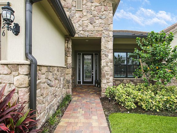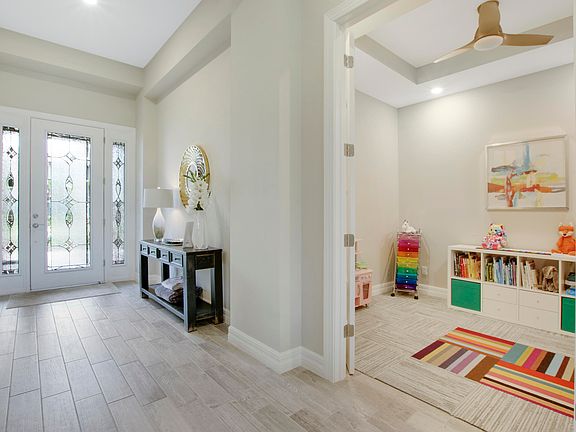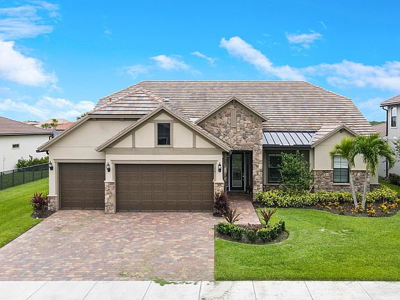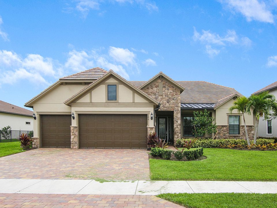 Built in 2019, this single story, 3,081 gorgeous square foot home awaits you in Jupiter's beautiful new community of Sonoma Isles. Enjoy several upgrades including custom lighting, Nest, Ring doorbell, soaring ceilings and a serene lake view. Builder options are incorporated throughout as well, including an extended garage, tray ceilings in all bedrooms and the den, luxurious coffered ceilings in the main living area and zero corner sliding glass doors. There are impact rated windows and doors throughout. On the interior, each window facing out to the street is adorned with plantation shutters for privacy.The beautifully appointed, white kitchen offers double ovens, a gas cook top, wine cooler, quartz countertops, a generous on-trend blue island, and an oversized pantry. The open floor plan incorporates ample dining space and a living area into the heart of the home. With custom lighting, Hunter Douglas shades (which can be controlled by your Alexa), breathtaking coffered ceilings and beautiful wood look tile throughout, you're sure to be pleased. Enter the master bedroom suite and enjoy subtle natural light, two spacious walk-in closets and an en-suite master bath that offers his and hers sinks, a soaking tub, a separate beautifully tiled shower with dual shower heads and a private water closet. While the split floor plan places the master suite on one side of the home, all other bedrooms are situated on the opposite side. Two bedrooms are "Jack & Jill" sharing a full bathroom between. The third bedroom is conveniently located adjacent to a full Cabana bath which can be accessed from the hall off the kitchen and also exits to the back yard. Generous storage awaits you in the 3-car garage with a full 4' extension from front to back. Behind the home and off the main living area, you'll find a covered, fully screened Lanai. Gas has been run to the lanai and the grill will convey. The backyard is ready for you to install a pool as it is fully fenced and a door to the cabana bath is already in place.