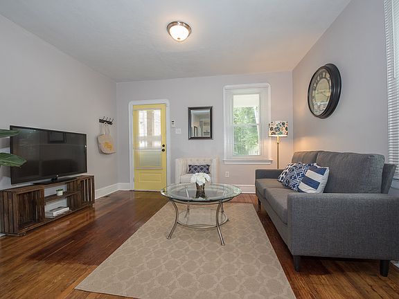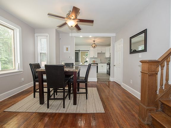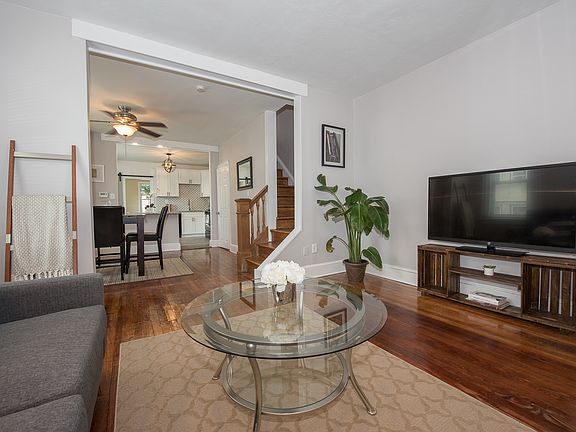 Completely renovated with gorgeous updates throughout, this twin is ready for you to move right in! With tons of curb appeal, this 3 bed/1.5 bath home has a large front porch, newer windows, and a fresh exterior that was professionally painted this spring. Step inside to discover gleaming hardwood floors, neutrally painted walls, and charming finishing details including exposed beams. The open floor plan allows a seamless flow between the living and dining rooms, making it the perfect space for relaxing or entertaining. Your dream kitchen awaits, which boasts granite countertops, new gas range and appliances, and soft close cabinetry. You'll love the farmhouse style details, such as the trellis backsplash, chalkboard wall, orb light fixture, and a sliding barn door that leads into the mudroom. This mudroom contains the laundry facilities and a convenient powder room, and provides access to the large, fenced-in backyard and outdoor patio. Head upstairs to find stained woodwork trim and doors throughout the second level. The hardwood floors continue in the master bedroom, which is adorned with a ceiling fan and plenty of closet space. Both of the other two bedrooms have brand new wall-to-wall carpeting. Also on this level is a completely updated full bathroom with a shower/tub combo, new flooring, and ceramic tile with a dark accent. With a walk-up to the third floor, this bonus space is just waiting to be converted. Other features include an unfinished basement with ample storage space, a 5 year old roof with 30 year shingles, central AC, and a forced hot air furnace. With so many upgrades throughout, this home feels like new! Don't miss the chance to make it yours!