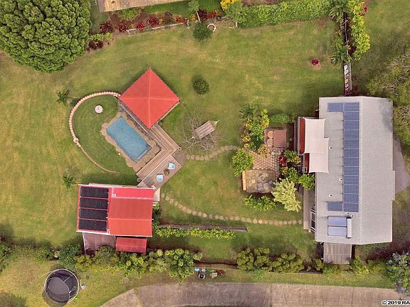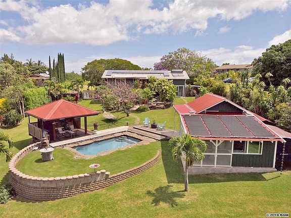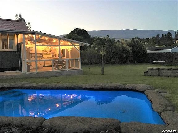 Tropical Oasis! Located in the heart of Makawao town but once on property, you feel once removed from everything! Starting with the "River-Flow Current" salt water, covered pool, which features a 10-hp pump which gives you the endless lap to swim, warmed by solar panels and graced with a handsome, Ipe-decked, 256 s.f. covered gazebo, that overlooks the fun and a stunning Haleakala Mountain view, complimented by a 354 s.f. screened in Pool House that has a "Siesta Room" and an outdoor kitchen featuring a 1952 Chambers gas range, used by Rachel Ray on her TV show plus a cabinet set, circa 1955. The landscaping is beautiful with mature plantings include a Koa tree, Jacaranda and Shower tree, bananas, tangerine and coffee, all within a fully fenced back yard - you would never know this was all happening on the drive-by. The main house has six steps up to a super clean, single-level, two-bedroom home which is in excellent condition and features an open floor plan with a Viking Range and hood in the kitchen. The large den/study adds plenty of useful space with lots of glass, bringing the outside in...and steps out to the tarp-canopy covered lanai, outdoor shower, bathroom and jacuzzi. The unfinshed basement serves as one of two workshop and storage areas. There is still room for an Ohana! Call now to set up your private showing.