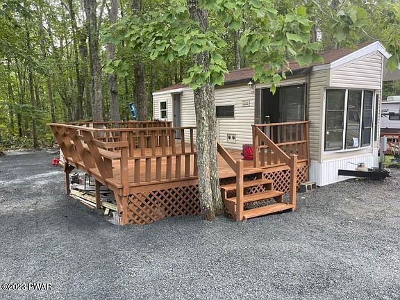 This 3 bedroom vacation trailer is great for outdoorsy families who need a beautiful space to stay after enjoying amenities in the Lake Adventure vacation community. The deck at the entry of this unit has built-in seating and a view to the community lake, which is walking distance. The modern kitchen area has a butcher block countertop, white cabinets, and fine finishes. A fireplace brings coziness and comfort to the open living area. You may notice the pretty wood doors of the bedrooms and bathrooms as you walk through the unit. Those natural wood tones compliment the stone sink on the rustic vanity in the bathroom which has a fully tiled shower. These design choices reflect the unit's proximity to nature, with a creek behind the unit leading to the lake, which has a nearby access point., Beds Description: 2+Bed1st, Baths: 1 Bath Level 1, Eating Area: Modern KT, Sewer: WS Comm Central