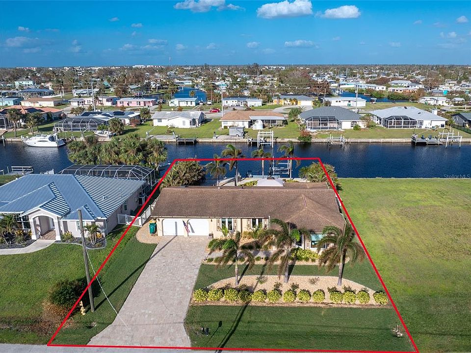 SAILBOAT ACCESS 80 FEET ON THE WATER WITH SWIMMING POOL. Welcome to a truly exceptional residence designed for both elegance and durability. This home is equipped with hurricane-impact windows, impact garage door, and impact sliders, ensuring peace of mind year-round. Polished Terrazzo floors add timeless charm and character throughout this house. At the heart of the home, an updated kitchen awaits, featuring wood cabinets with large pull-out drawers, quartz countertops, stainless-steel appliances, under cabinet lighting and a beautiful tiled backsplash. Sunlight fills the space through large picture windows, creating a bright and welcoming atmosphere that’s perfect for gatherings or quiet family moments. Step outside to your private backyard oasis. The entire backyard is landscaped in low-maintenance stone, making upkeep a breeze. The fenced backyard, lined with Areca palms along each property line, provides privacy, while Foxtail palms frame the custom pool area. This serene retreat features a luxurious swimming pool with a waterfall hot tub and sun shelves, creating the perfect spot for relaxation and leisure. For water enthusiasts, this home offers an 80-foot concrete seawall, a 20-foot dock, and a boat lift with direct sailboat access to open water—no bridges to navigate, and just minutes to the Harbor. Two large bedrooms with 2 spacious and beautifully updated bathrooms. Both bathrooms have new vanities and walk-in tiled showers. A large indoor laundry room provides ample storage space, adding to the home’s functionality and convenience. This residence blends modern comforts, low-maintenance landscaping, and an enviable waterfront lifestyle—ideal for those seeking the perfect blend of luxury and ease. This property is close to Port Charlotte Beach which has a public swimming pool, boat ramp, volleyball courts and playground. This house is centrally located to shopping restaurants and hospitals, and a short ride to Punta Gorda Airport.
