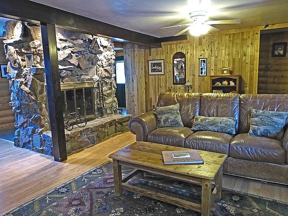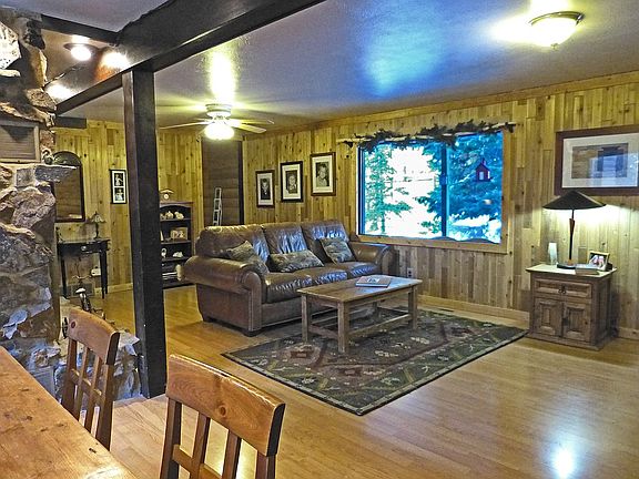 Amazing 1.4 acre lot with endless possibilities. The lot is flat accommodating for the construction of a workshop or fenced in area for animals. The trees provide plenty of privacy and quiet to enjoy the mountain living without being too far away from town! This wood sided home is loaded with mountain charm including log facing on the main level and a huge moss rock fireplace to center the main level. The kitchen, dining room, living room, and den all flow together with an abundance of natural light. Enjoy the option of main level living with the owner's suite and full bathroom just off the den space. Working from home is easy with the built-in work station and plenty of bedrooms to use as an office. The home also comes equipped with fiber optic internet, so you don't have to worry about your connection! The upper level has a loft, two spacious bedrooms and a full bathroom with architectural charm. The walkout basement gets plenty of natural light during the day and has an additional large living space and wood burning stove. The large laundry room off of the family room leads to the spacious 3 car garage. An additional two bedrooms and full bathroom round out the basement living space.