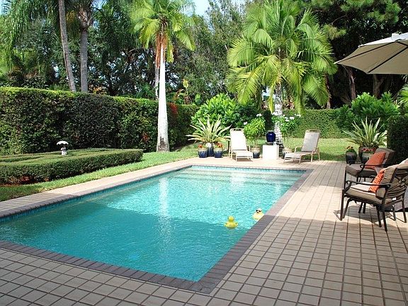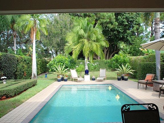 VERY PALM BEACHY with loads of tall hedges & lush landscaping surrounding an extraordinarily unique pool & patio area; all set in a VERY private, spacious & magnificentbackyard. Only Pool in the entire community like this one(goes length wise instead of width wise)...This home is absolutely lovely, W/a modified kitchen loaded W/additional storage & cabinet space, a wonderful hutch/bar area added in DR, SS Appliances, granite countertops, & updated hardware & fixtures. You will also find updated Bathrms,loads of cove/crown ceiling moldings, custom built-in bookcases, quality ceiling fans & light fixtures, the best Carmel Model floor plan W/his & her on-suites off the master, a beautiful front room & Foyer entry; a newer solar system W/hot water & pool heater, Newer AC, reverse osmoses...