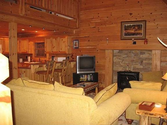 INVESTORS! GREAT RENTAL PROPERTY! Quality log home just 5 years old. Delightful 1170 SF wrap-around porch with covered area just off master bath - perfect for a hot tub. Pine logs, knotty pine floors, Vermont Castings propane gas stove, large loft. Large tile master shower. 2 car tandem carport (12 x 38) with attached 8 x 9 storage. Tongue and groove ceilings. Beautiful cabin furniture included. New landscaping and exterior log treatment.