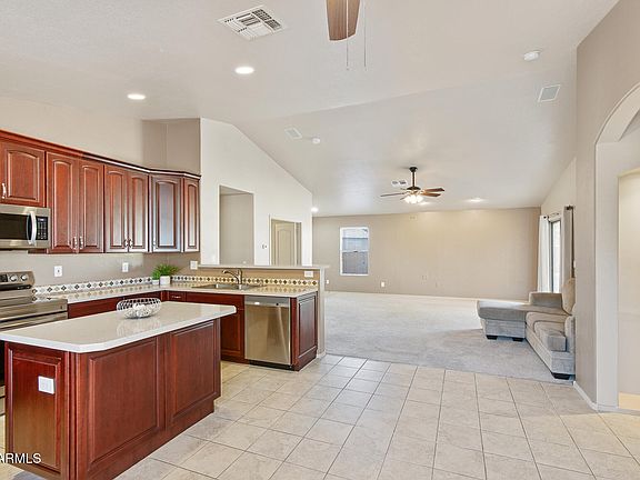 Exceptional single-level home situated on a prime cul-de-sac lot! The expansive great room, with its soaring vaulted ceilings, creates an open, airy feel in the primary living space. The eat-in kitchen features a breakfast bar, quartz countertops, a center island, ample cabinetry, and stainless steel appliances—perfect for everyday living and entertaining. The master suite includes a walk-in closet and a full en-suite bathroom. The convenient 2-car garage, complete with epoxy flooring, has built-in storage cabinets, a hot water heater, and a soft water loop. The oversized backyard offers exceptional privacy and includes an extended covered patio, a storage shed, and a spacious side yard ideal for RV parking. This home perfectly combines functionality and comfort!