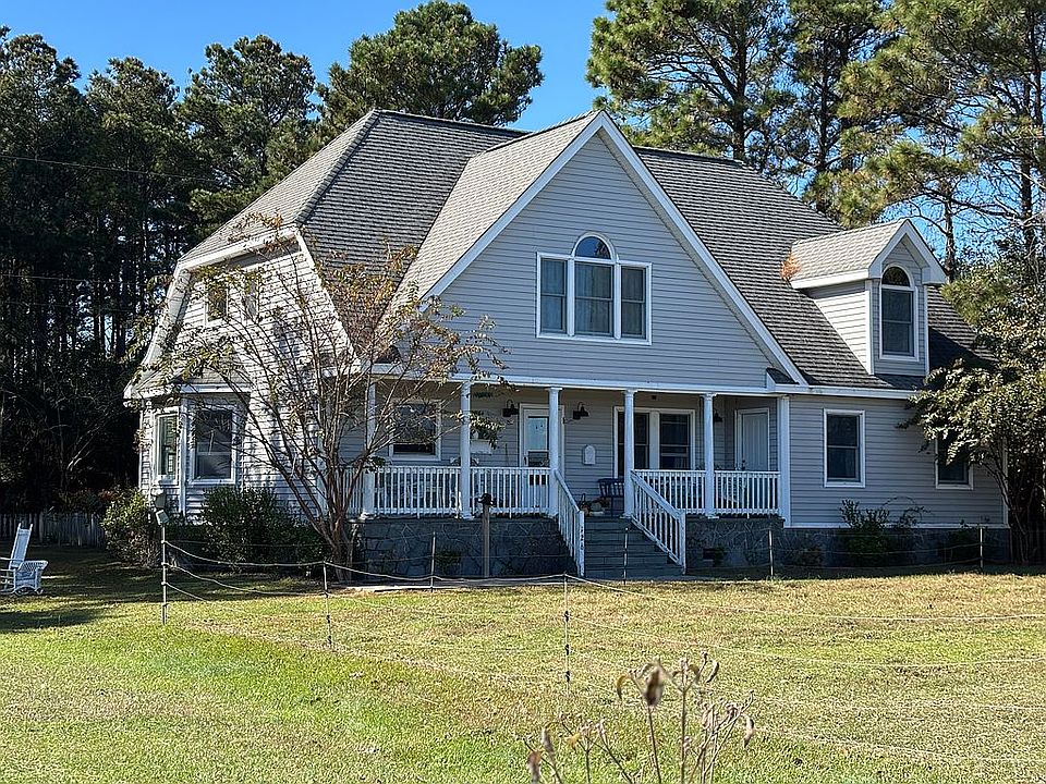 Tucked away at the end of a quiet country road, this 4 bedroom, 2.5 bathroom home offers over 2,600 sq. ft of living space and sits on .92 acres surrounded by beautiful pine trees. It boasts a stunning waterfront view of the Currituck Sound and the Currituck Lighthouse, visible from many rooms. The home features LVP flooring throughout, brick tile in the laundry room, and carpet in the bedrooms. The property also includes apple and peach saplings, Limelight hydrangeas, gardenias, a white Dogwood tree, and so much more throughout the acreage. *BUYERS AGENT FEE AVAILABLE