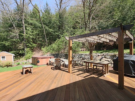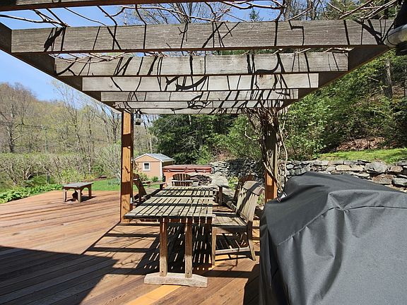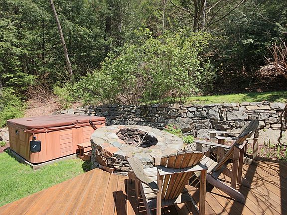 This notable Georgetown home was built in 1850 as one of several "bunk houses" for the factory workers at the old Gilbert and Bennett wire mill. Retaining all the charm of yesteryear including wide board floors and hand hewn beams, this historic home has been polished to perfection after extensive remodeling and expansion by the current owner in 2008/2009. Picturesque setting, perched high with stone walls, manicured lawn and flowering gardens, overlooking the Norwalk river (stocked with trout every April by the CT DEP). Walk to the Branchville train station and all the Georgetown/Branchville hot spots, yet tucked back privately. Whether relaxing on the deck by the fire pit or soaking in the hot tub, enjoy the sense of being totally tucked away with only the soothing sound from the cascading waterfall directly across the street. Total 1,785 square feet with 3 bedrooms and 2/1 baths on 3 finished levels including lower level office/den with half bath. The light and bright great room features original timbered ceiling and chestnut floors, and incorporates the living room with wood stove (which can heat the entire house most winter days), dining room, and stylish chef's kitchen boasting Aga gas range, marble counters, tumbled marble floor and back-splash, hammered copper farm sink, and custom cabinetry. Extensive updates including all baths; roof, siding and insulation; cedar deck, fire pit and hot-tub; propane heat, hot water and range; plus central air. True pride of ownership in this very special home.
