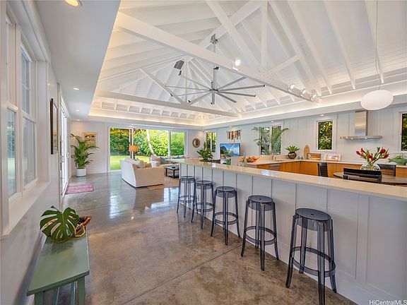This impeccable Lanikai residence is an architectural gem, crafted with exquisite millwork & detail. Built in 2014, it offers the timeless charm of Hawaii's plantation style with clean, modern elegance. On an oversized level lot, the 5-BR, 4-BA home features incredible natural light, reflecting upon impressive vaulted ceilings, through expansive windows & doors. Neutral, polished concrete floors at ground level are both functional & beautiful, with rich hardwood upstairs. The generous living space seamlessly extends outdoors to a wide covered lanai, & a 40-ft shimmering tiled pool and spa, surrounded by lush, colorful landscape. At ground level, are 2 spacious BR with high ceilings & a full BA which can be used singly, or together as a large guest suite with separate entrance; a laundry room; & another full bath, with indoor/outdoor shower, perfect for rinsing off after a visit to Lanikai Beach, just six houses away. Upstairs, 3 BR & 2 full BA are divided into 2 wings by a grand staircase, offering separation for the primary suite. A large garage and driveway parking complete the package. Don't miss this exceptional opportunity to own in one of Oahu's most desired neighborhoods!