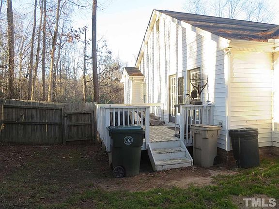 Cute ranch nestled at end of cul-de-sac. 3 Bedroom, 2 Bath. Welcoming covered front porch. Family room opens to private back deck, and fenced yard area with raised herb bed in corner. Outside storage room. Good-sized lot stretches back into trees for shade & privacy. Additional green space behind. Quiet neighborhood just minutes from local shopping & schools. Short commute to Raleigh downtown. Great home for starter or investment.
