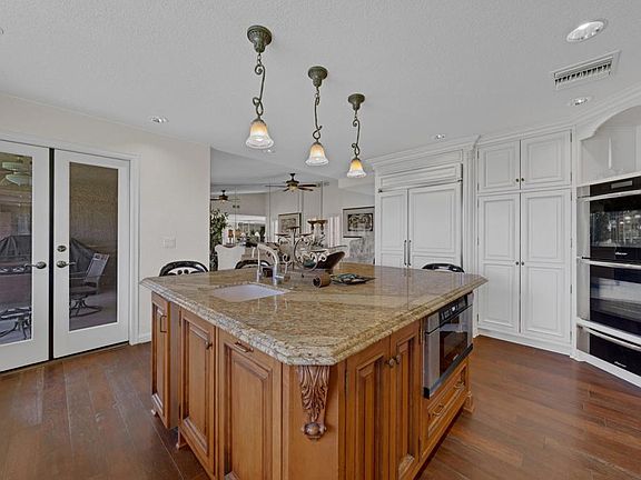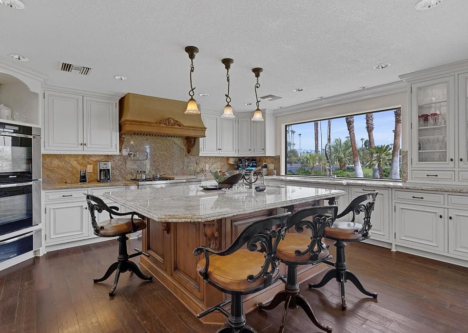 One of the most sought-after locations, corner lot with north/west mountain views overlooking a pool/spa and green fairways. Walking distance to the clubhouse and fitness center! Custom open concept kitchen with granite counter tops, new cabinets and high-end appliances - Thermador cook-top, Dacor double oven, Miele dishwasher. In addition, over-sized kitchen window, large kitchen island, wood floor and built-in refrigerator. Custom french doors at the home's rear elevation lead to a large covered terrace and extended patio. The 3rd garage addition with tile floors, tankless hot water heater and extra storage cabinets are a huge plus! This home is a must see.