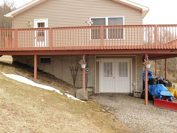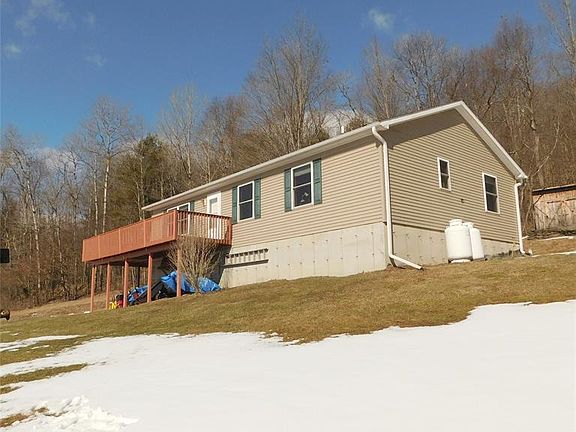 Meander up the long drive to this move in ready 3 bedroom, 2 bath home. This is a high quality, modular, stick built home from Bill Lake Modular Homes. Full of light, with commanding views from all front facing rooms and surrounding, 35x31x8' wide, deck. Underground electric, whole house water filtering system and a choice of Frontier (current owner) or Spectrum for internet. The walk out basement is framed for garage doors and plumbed for a third bathroom. Use the open 1300 sq ft, dry basement, for your choice of uses - game room, home theater, hobby room. The 12x10 shed is immaculate. Enough open property for lawn, gardens or animals. Wooded property for hunting and hiking.