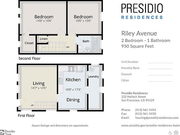 Riley Avenue is a quaint historic streetscape tucked within the Main Post, the cultural heart of the Presidio. The neighborhood features twelve homes. Six two-bedroom residences were built in 1909 as senior officer housing and feature roomy front porches for enjoying the view of the Golden Gate Bridge and an enclosed back porch for laundry and storage. Six three-bedroom homes were built in 1931 as enlisted family housing and feature an enclosed sun porch and a formal dining room. They also feature basements for storage and laundry. Riley is an easy jumping-off point for enjoying the open spaces at Crissy Field, the historic treasures of the Main Post, and the Presidio's extensive trail system. The Presidio Residences is pleased to announce availability in our Riley neighborhood. These brick duplexes feature hardwood floors, historic details, and beautiful bridge views. There is a laundry room with washer and dryer hook-ups and a one-car detached garage. Offered at $5,180* per month, 126-A Riley Avenue a 2-bedroom, 1-bathroom duplex with approximately 950sq. ft. We will have an open house to show the home on Tuesday, March 22 , 2022 from 10:00 am - 11:00 am. Due to the high volume of interested households, we will begin accepting holding deposits on Wednesday, March 23, 2022 starting with Presidio-based employees. If applicable after 11:00 a.m., and according to our priority system, we will offer these homes to general public households who have confirmed their interest. Additional Information: Holding deposit is $5,180 Application fee is $46 per adult Parking permit for each additional vehicle is $75 per month 2cars maximum Two pets per household with an additional $500 deposit and $50 pet rent per pet. Current vaccination records, spaying/neutering records, emergency caregiver contact information, and veterinarian contact information are required All applicants must meet the Presidio Trust's standard residential screening criteria. This includes, in part, a credit check, criminal background check, verification of income and assets, and verification of past residences. *Prices reflect a twelve-month lease with a move-in date by or before 4/1/22. Other options and longer lease terms are available, please speak with your leasing agent for details. Pricing may change after 3/22/22. We want you to know that your health, along with the health of our residents and team members, is our highest priority. Prior to touring, a leasing agent will go over our COVID-19 Health and Safety Precautions with you. Additionally: Wearing face masks is required during the tour regardless of vaccination status. In the past 10-days, if you have experienced fever or chills, shortness of breath or trouble breathing, cough, fatigue, muscle or body aches, headache, sore throat, congestion or runny nose not attributed to allergies, new loss of taste or smell, other flu-like symptoms Get to Know the Presidio Events Food Golf PresidiGo Shuttle Trails Biking Places To Visit Community Amenities Historic Detail One Detached Garage Space One, Two and Three Year Leases Public Transportation Recycling Apartment Amenities Bridge Views Dishwasher Disposal Extra Storage Full Basements in Three-Bedroom Units Hardwood Floors Refrigerator Washer and Dryer Hook-Ups. Our leasing office is open Monday through Friday from 9:00am to 6:00pm and Saturday from 10:00am to 4:00pm. We are closed on Sundays. Please Note: Contaminants associated with a former fuel distribution system have been found on land on the west side of Riley Avenue. The Presidio Trust is consulting with the San Francisco Bay Regional Water Quality Control board on the next steps at Riley Avenue, including further investigations and identification of a long-term solution. Federal law prohibits housing discrimination on the basis of race, color, national origin, religion, sex, familial status, or disability.