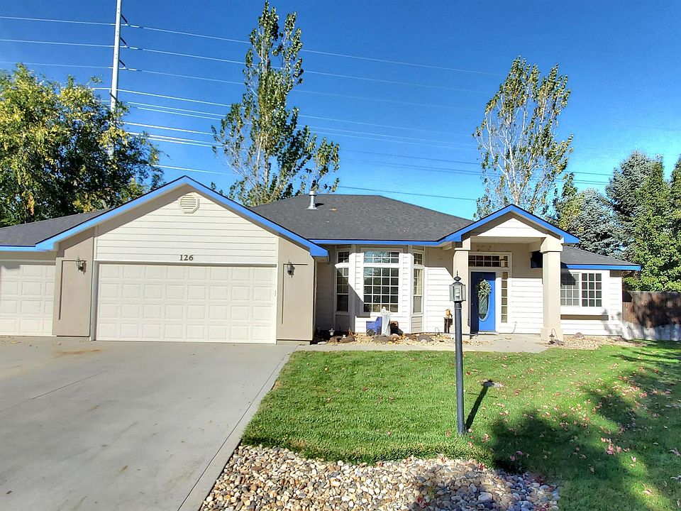 Fabulous, 1-level home with 3-car garage in cul-de-sac location in SW Nampa! Covered patio, storage shed, fenced yard, Hardi-plank siding with stucco accents, kitchen with corner pantry, breakfast bar, and all appliances included! Large master suite with jetted tub and separate shower, dual vanities, and walk-in closet! Small water feature in front (currently not running). Pergo style flooring on slab foundation. 3rd bay garage is separated with a wall for a workshop, but can certainly be removed, if so desired. Quality, Darwin Ames Construction!