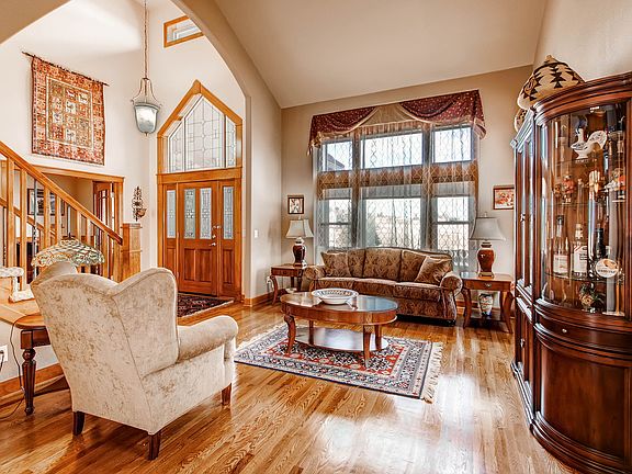 Inclusions*: Tractor. Make your way up the private driveway to a five acre oasis away from everything yet close to it all. Watch the sunrise from the new deck complete with hot tub and self cleaning pool and the sunset from the patio off your living and dining room. New hardwoods greet your arrival and guide you to the open concept kitchen with marble counters and a vaulted family room with a fireplace. Work in style from the main floor office. Upstairs is a luxurious master with jetted tub and three additional large bedrooms all with new carpet. Views continue to abound in the large unfinished basement. The entire home boasts new windows, custom blinds and a new tile roof.