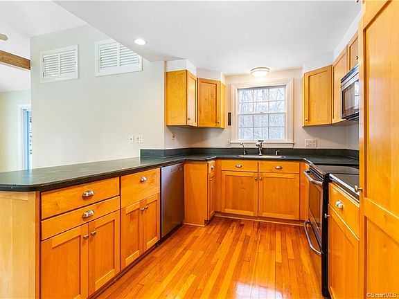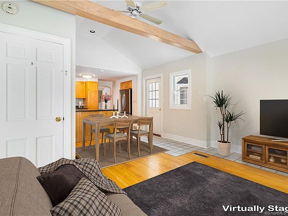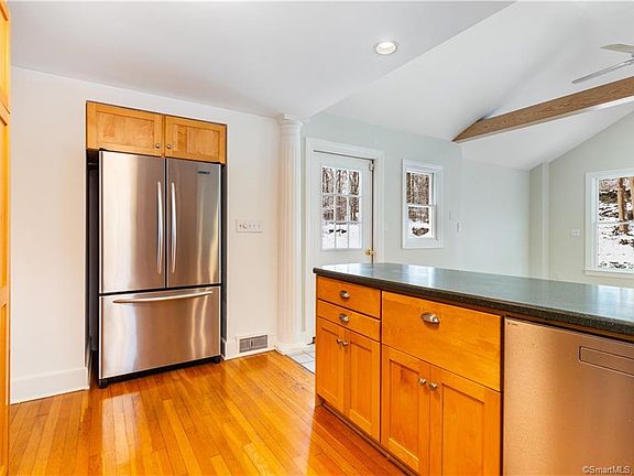 Charming light drenched 3 bed 2 full bath Cape on 1.31 acres of cleared flat land. Stone driveway flanked by professional landscaping provides the perfect entrance to this bright and sunny home. The living room has skylights, a bay window, wood burning fireplace and sliders to a deck leading to a private back yard with a fenced in garden. The open concept kitchen and family room boast a vaulted ceiling with exposed hardwood beam, another set of sliders out to backyard, and a glass door to private blue stone patio, perfect for bbq'ing, relaxing and dining. Upstairs is the master bedroom with a vaulted ceiling and its own private bath. Hardwood floors throughout. 2 bedrooms and a full bath on the main floor. The detached garage and gravel driveway provide plenty of parking space. Just off the blue stone patio is even more cleared yard for relaxing, playing ball games, or for playground set. This classic home is located less than 2 miles to the Metro North Train Station to NYC for easy commuting! Conveniently located between Wilton and Ridgefield town centers, close to Wilton's award winning schools, 2 miles to Georgetown and its restaurants, restaurants and grocery store, walking distance to Wilton Town Forest for hiking and outdoor recreational activities.