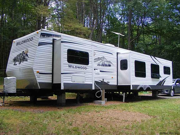 Great location with private setting of almost 1 acre with 200' road frontage! 2008 Turn Key Furnished Wildwood park model trailer(replaced previous trailer) with 2 slide outs in mint condition. 1BR 1BA Liv rm w/ electric fireplace & kitchen. Deck, gazebo, shed and yard to enjoy nature. Close to Edinburg town beach, marina, town center and 5 minutes to Village of Northville.