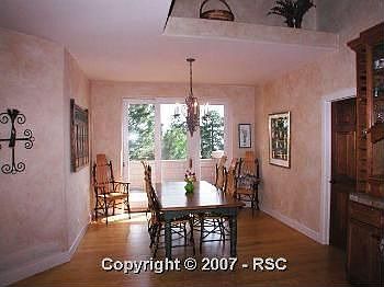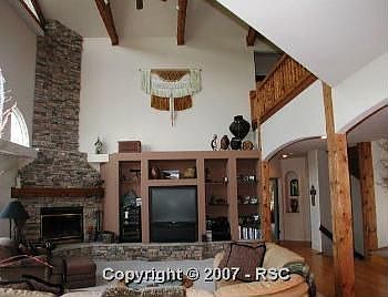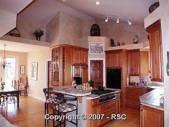Open to the Great Room, the Kitchen features Italian tile counter-tops, Jennaire double ovens and six-burner gas cooktop. The two story Great Room offers truss beamed ceilings, abundant windows and a cultured stone fireplace. The Master Suite boasts a lar