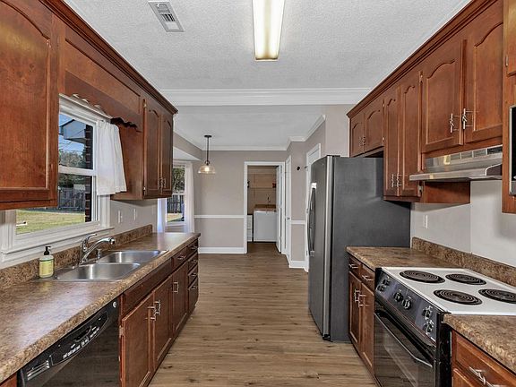 Full brick 3 BR, 2 Bath ranch style home located on large corner lot, covered front porch, privacy fenced back yard, detached shed. Open floor plan with 9 ft ceilings. Enjoy the fireplace in the living room that also features laminate floor and crown molding. Kitchen has a bay window in the breakfast area. Kitchen has pantry, and refrigerator stays. Isolated MBR with full bath & walk in closet. 2 more BR & Full bath, Laundry room, washer & dryer stays. Side entry garage with extra storage area & access to the back yard. Minutes from Walmart & Publix. No smoking. Pets allowed on a case by case basis. Tenant to pay all utilities, water, propane, lawn care, trash removal, internet, cable, etc. Willing to discuss short term lease options. Qualifications include: credit score of 600+, clean credit and background check, no eviction history, good references from previous landlords, must have monthly income available of three times more than the monthly rental rate which will include any debt payments.