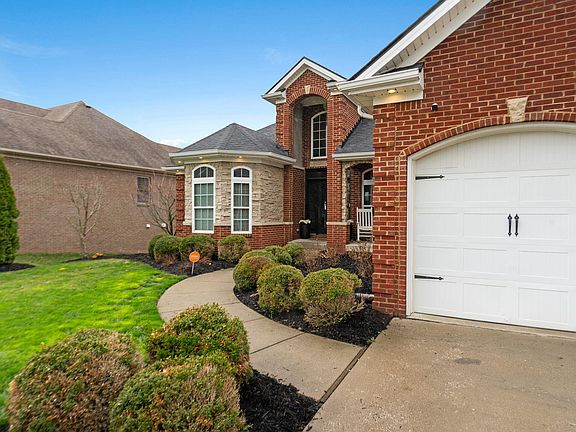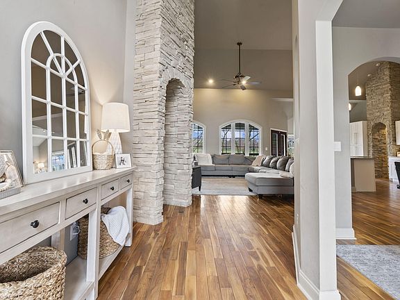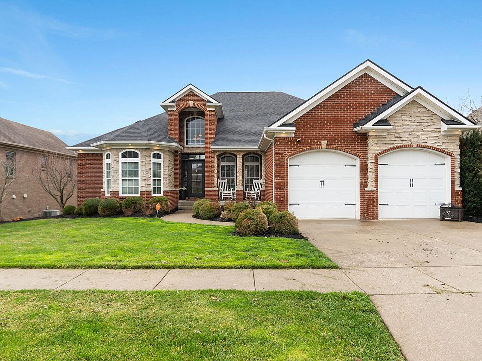 Experience luxury living at its finest. Situated on the 5th hole of the prestigious Cherry Blossom Golf Club Community, this gem showcases above-par finishes and meticulous attention to detail. The well-designed layout features main level living with the added bonus of a beautifully finished basement. Upon entering, you are greeted by the stunning detail of stone archways and an abundance of natural light that fills the space. The chef's kitchen offers style and function with a large island, gas range, and extended cabinetry. The open concept lends for a seamless flow throughout the home. While the split bedroom design ensures privacy, with a true owner's retreat that includes one of the home's three fireplaces. Prepare to be amazed by this spa-like bathroom and dressing room. Two additional bedrooms and a utility room on the first floor offer convenience for daily living. Venture down to the lower level to discover the bourbon bar and theater, the home gym, office, and additional bedroom that provide versatile spaces for training, remote work, and private guest quarters. Enjoy panoramic views and stunning sunsets from the covered back porch.This is an exceptional home.