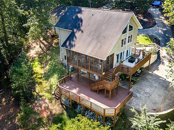 Welcome to the lake from this two story vaulted family room and greeted by a huge wall of windows overlooking Lake Hartwell. The open kitchen in this home has a large center breakfast bar surrounded by Oak cabinetry, Granite countertops and breakfast area. The family room is open to the kitchen and provides an open entertaining space. As you walk out from the kitchen, an oversized screened in porch leads to a large deck outside- where you can sit and enjoy the wonderful lake views. There is a full bathroom, and two bedrooms located on the main floor of this home. Upstairs takes you to the balcony overlook the leads into the private master bedroom. This master bedroom has plantation shutters, a huge walk in closet with its own washer and dryer. The master bath has a large steam tile shower and granite countertops. The basement of this home provides a double car garage with the washer and dryer, a bathroom, and extra cabinetry, sauna room. Walking out of the basement you walk onto a deck that overlooks the backyard. This property also includes a separate two car garage with an attached guest suite/apartment that has a open kitchen with plenty of cabinet space thats not included in the square footage total, living room/bedroom combination, and private bathroom with tub/shower combo. The garage with extra storage can be entered into from the guest suite. The natural wooded lot joins the army corp of engineers property at the rear, where you will find a tranquil creek that runs into Lake Hartwell. At the lake you will find a platform dock already in place that you will enjoy leaving your boat hooked too, fishing, canoeing, or swimming. Water and sewer are on the same line as the house. The upstairs HVAC unit is 4 years old and the downstairs HVAC unit was just put in 12/19 per sellers. Chickasaw point has an 18 hole golf course, is a gated community with guard on duty, clubhouse, olympic size swimming pool, tennis courts, pickle ball courts, basketball, beach area, boat ramp, marina, pavilion with grills and picnic tables- all overlooking gorgeous Lake Hartwell. They also have a pet park, pro shop, the Trails Grill -where you can go grab a snack, playground, and walking trails. This is a beautiful area in a great location - convenient to I-85 located on Lake Hartwell.