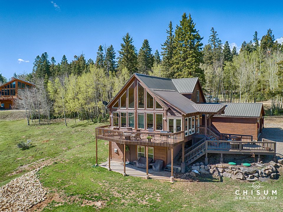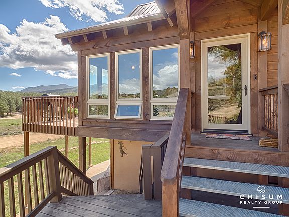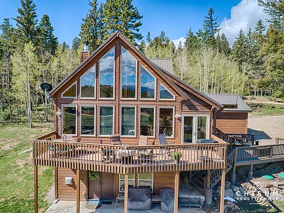 Lets explore this custom 2004 built home in the mountains of Angel Fire, New Mexico. Located on a stunning 5.8 acre lot with a gentle driveway, towering aspens, seasonal stream and plenty of room for recreation. The expansive mountain views can be enjoyed from the large front deck, great room, loft, and from the outdoor hot tub, which is very private. The front deck has low maintenance Trex decking and the home is outfitted with radiant floor heating, including the garage. Inside, you'll find a spacious great room with vaulted ceilings, a large window wall (Marvin windows), wood beams and a fireplace surrounded by stone. The kitchen features stainless steel appliances, tile flooring and solid wood cabinets. Adjacent to the great room is a game / pool table room with solid wood wainscoting. The first floor also features two guest bedrooms, full bath with dual sinks, and half bath / laundry room that leads to the oversized garage. Upstairs you'll find the master bedroom which contains a walk-in closet, vaulted ceilings, fireplace and ensuite bath with dual sinks, tile flooring, and a soaker tub. Custom built by the owners and never before on the market. Come tour 11 Via de Maria today!