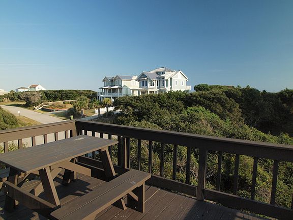 Second row to the ocean, and a cul de sac location with good ocean views, this 1/2 duplex has 3 BR and 3 1/2 baths. The master suite IS the top floor with a lovely private deck and ocean views. Each of the 3 lovely bedrooms has its own private bath! Plus a 1/2 bath to support living areas! 3 pvt decks, masonry plank siding, & dbl storage rooms + hot/cold outside shower and ample room for parking round out this package. Quick and easy walk to the beach access. Furnished w/ rental history of 24K++