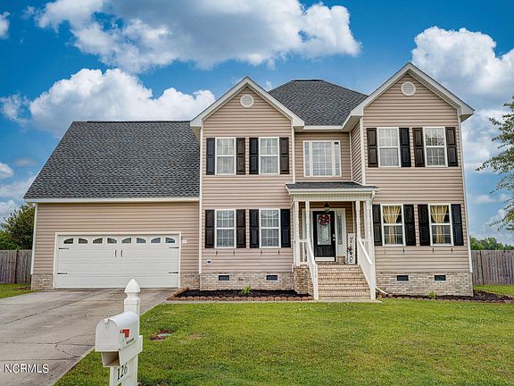 This house has it all! New roof in 2024. Transferable 25-year warranty. Encapsulated crawlspace with dehumidifier. Over 2400 square feet, beautiful and spacious 4 bedroom, 2 and a half bath home. Large yard with deck. Close to Camp Lejeune and MCAS New River. Convenient to beaches and shopping. Plenty of storage with large walk-in closets. Open Family room features a Fireplace with gas logs. First floor office. Eat in kitchen. New appliances. Formal dining room. Master suite has trey ceilings, attached bath with large, jetted tub and separate shower. Schedule your private showing today!