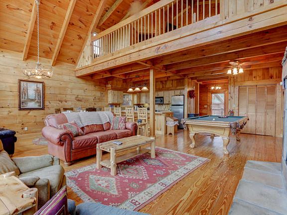 This cozy log chalet features amazing views overlooking Gatlinburg and extends to Mt. LeConte at the very top of Smoky Mtn. Village. Enjoy the view of Ober Gatlinburg from the hot tub on the back deck. Vaulted ceiling, custom rock showers with plenty of room to play and relax. Comes fully furnished and appliances convey. Level parking and on an active rental program. Great vacation home and/or investor vacation rental property.