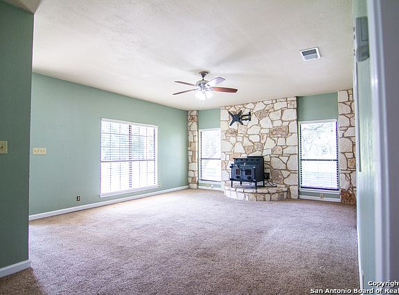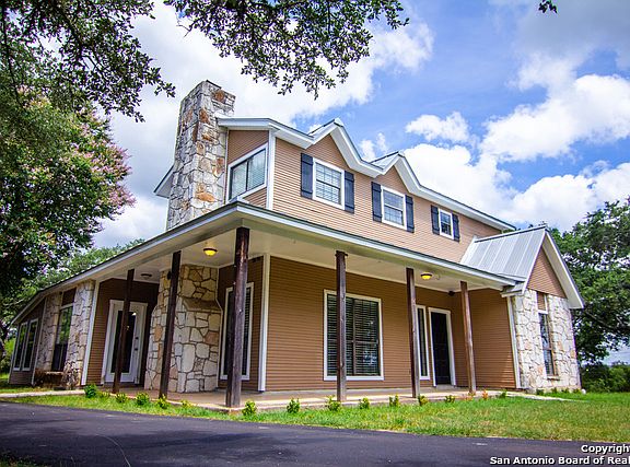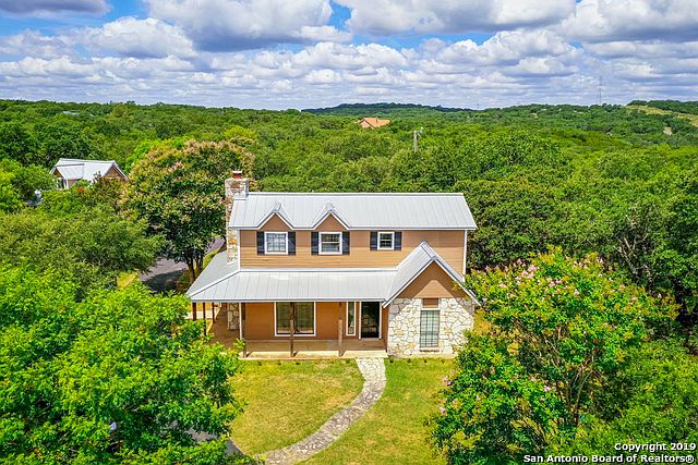 Open 8/3 12-3 pm.This move-in ready home boasts ample natural lighting, interior stone work with new carpet. The downstairs master bedroom offers a dual vanity, tile floors & a separated tub with shower over it. The utility room is connected to the master w/storage. The kitchen offers wood cabinetry w/double ovens, an island w/range & black appliances. The garage offers a shop space w/unique bonus room above. This property offers a fenced garden area, raised garden beds & chicken coop. 3 miles to HEB & 281